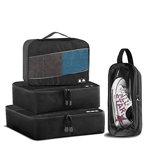 - 4 Packing Cubes: Large (43.2*11.4*31.8 cm) Medium (38.1*10.2*26.7 cm) Small (33.*7.62*22.9 cm) Shoes Bag(32 * 13 *11cm)